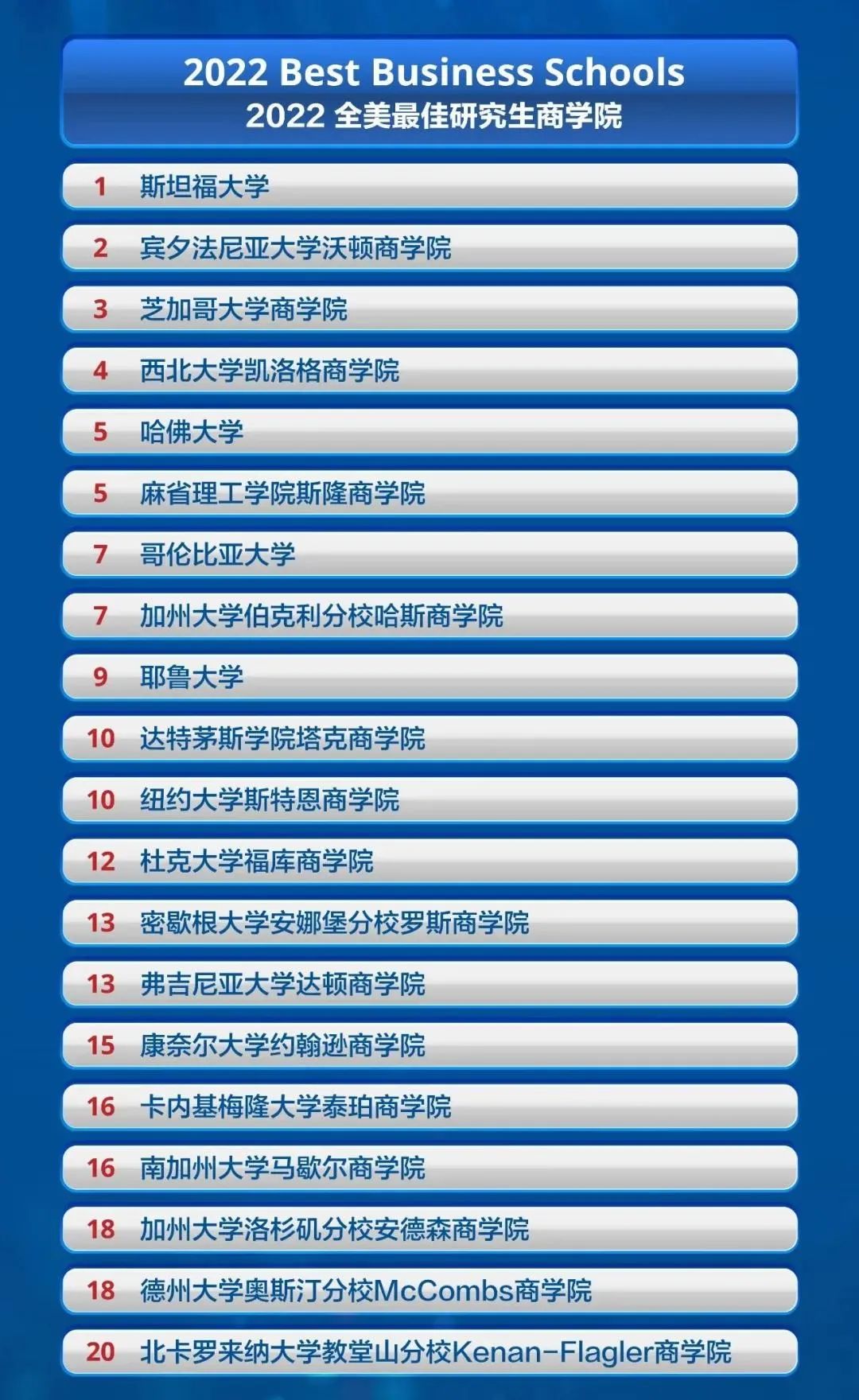 商学院排名将薪资水平纳入考核范畴。在今年排名中,斯坦福和宾大保持了去年第一和第二的位置;芝大从去年的第4名升至第3名;哈佛和哥大相较去年均上升一位,位列第5位和第7位;达特茅斯从去年的第12名升至第10名。