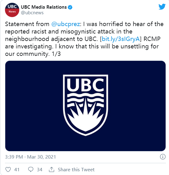 UBC校长Santa J. Ono博士通过Twitter发表了声明,对该事件表示震惊和不安。