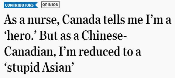 对华人医护人员如此公开、恶毒的种族歧视,我还是第一次经历。我的父母上世纪80年代移民来到加拿大,我生于多伦多,也长于这里,我一直把自己当加拿大人 。