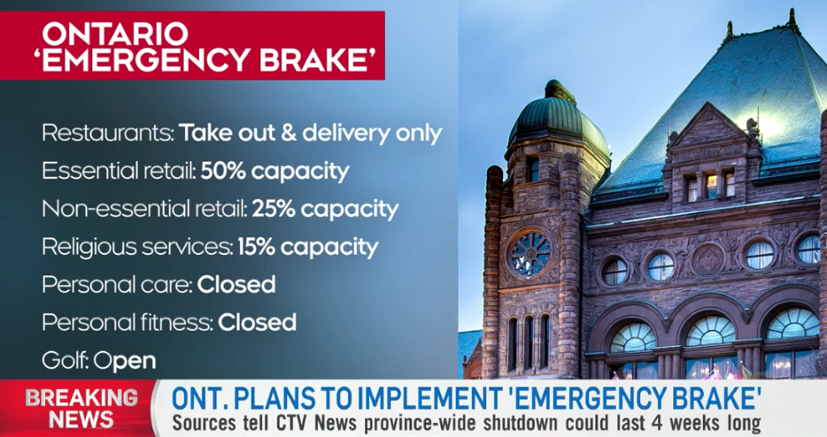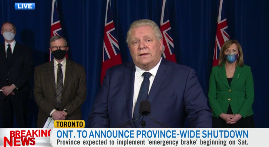 安省省长福特下午在新闻发布会上宣布,从2021年4月3日星期六凌晨开始在全省范围内实施长达一个月的紧急刹车(Emergency Break),持续至少四周,以控制病例和住院人数的增加。