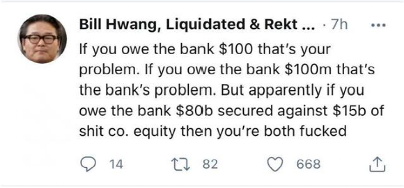 近日,Bill Hwang在社交媒体发文称,“如果你欠银行100美元,那是你的问题,如果你欠银行100万美元,那是银行的问题;但如果你欠银行800亿美元担保150亿美元的股票,那你们就都完蛋了。”