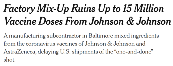 《纽约时报》称,据了解,Emergent公司不仅为强生公司代工,也为阿斯利康公司生产疫苗。污染事件发生后,Emergent公司甚至都不知道自己捅了篓子,反而还在继续生产疫苗。如果不是强生公司的质检员发现问题,被污染的疫苗剂量还要更多。