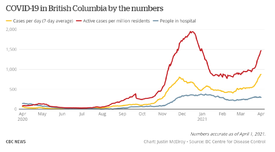 (BC省疫情曲线,红线为每百万人里的现存新冠患者人数 图自CBC)