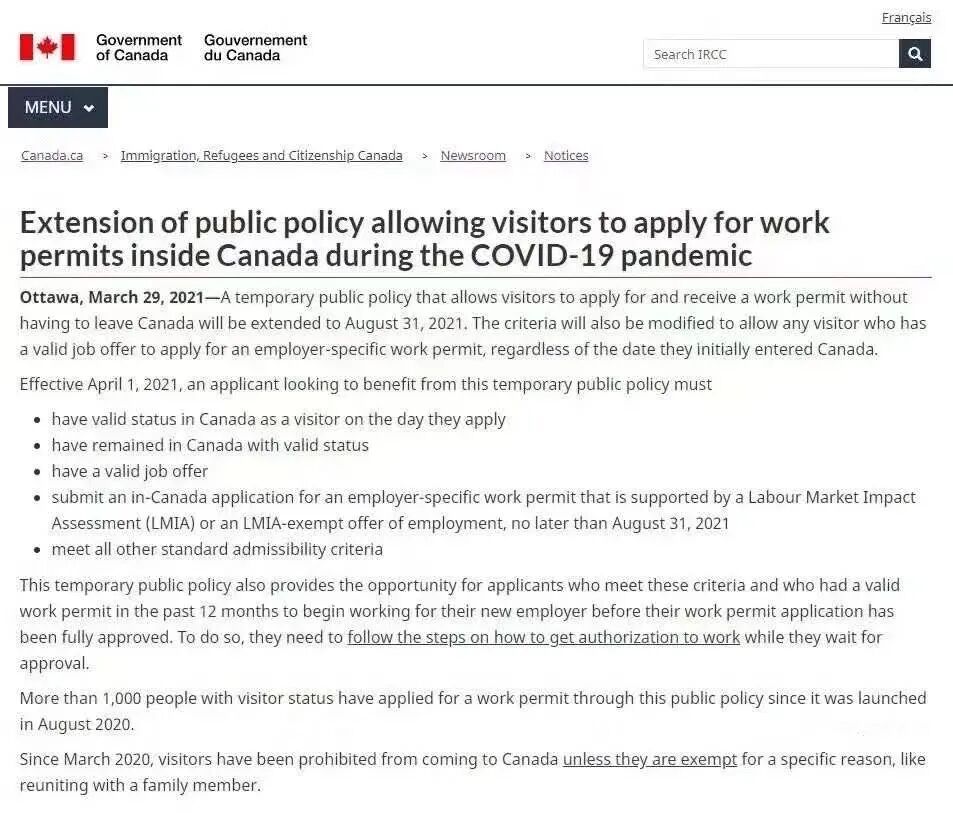 2021年3月29日,加拿大移民部(IRCC)延长2020年疫情特殊政策,允许持工签的临时居民在无需离境情况下申请延签。