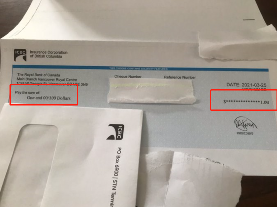 而且,她的推特还真被ICBC看到了。该机构表示,以前5加元以下都是不退的,现在公司政策变了,就算只有1块钱,ICBC也会很负责任地把支票邮寄上门。