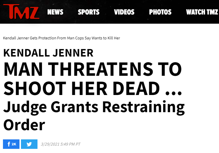 被人非法闯入的事儿还没过去,第二天,也就是本周一,肯豆向法庭申请了一份对另一名男子的临时限制令,因为这名男子威胁称要枪杀肯豆……