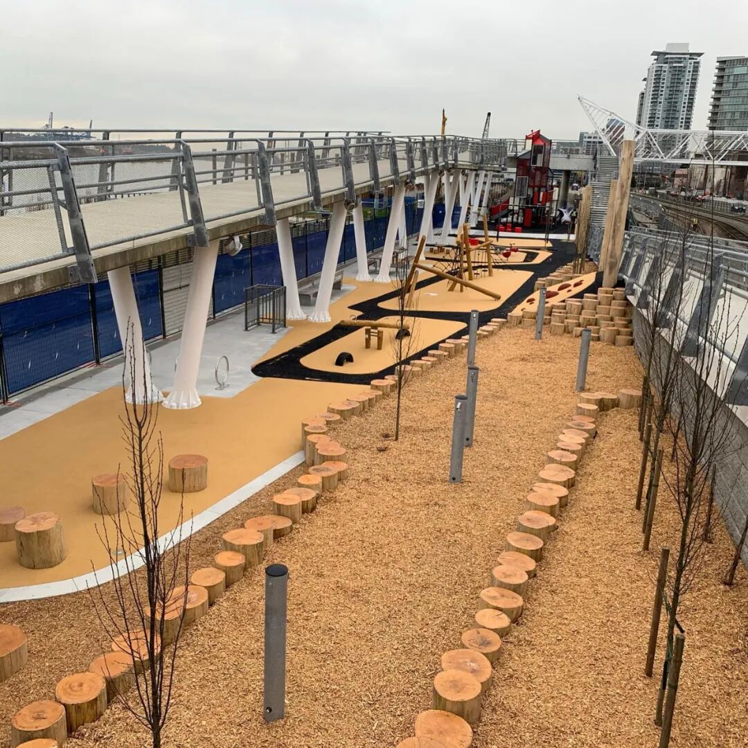 但设计师用了其他方法来弥补损失,并且让New Westminster Pier Park更好玩、尤其是更适合孩子:在6街的人行天桥下方,设置了全新的儿童户外娱乐场所,提升了这座公园的亲子娱乐体验。