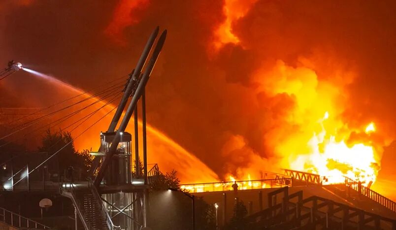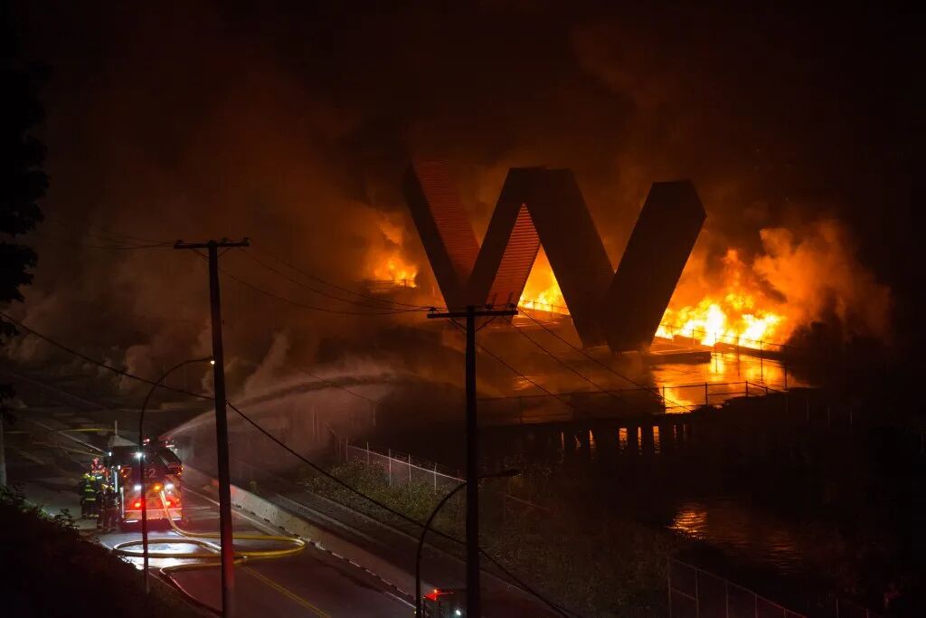 一时间,火光冲天,码头公园都被付之一炬,现场就像灾难片那样。消防员奋战了一夜,才把火势扑灭,但当时大家都很悲观,认为新西敏码头公园已经不可能恢复如初,因为损伤太严重了。