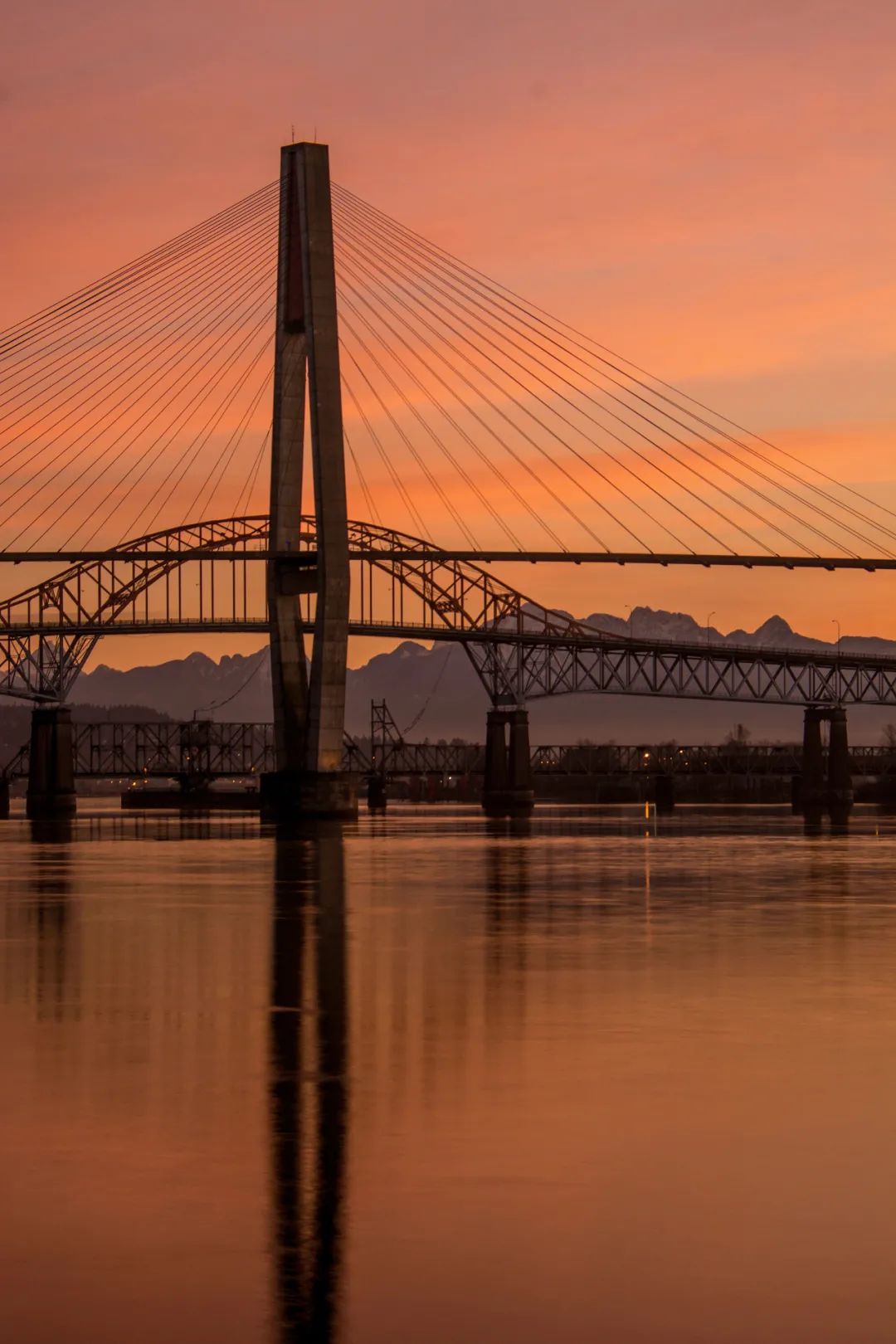 在夜幕降临的时候,New Westminster Pier Park的颜值会提高:大半个公园的区域都会亮起灯光,非常浪漫。伴着面前的Patullo Bridge、菲沙河散步,会很惬意。