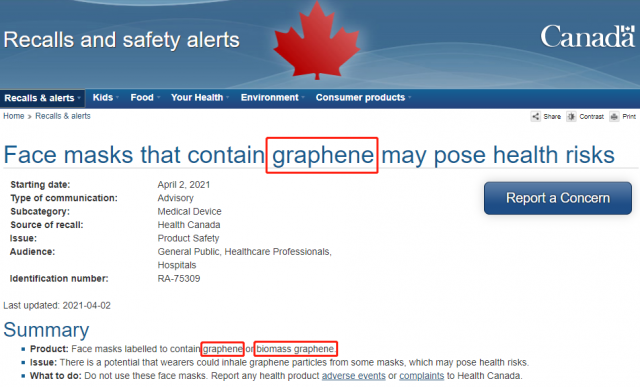 4月2日,加拿大卫生局发出的声明表示,禁止使用含有石墨烯或生物质石墨烯的口罩。原因是佩戴者有可能吸入石墨烯颗粒,从而对肺部造成伤害。
