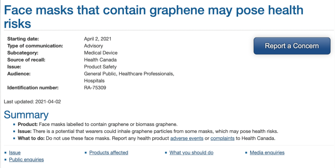 目前,加拿大卫生部已经紧急促请口罩分销商召回所有含有石墨烯(graphene)或生物石墨烯(biographene)口罩,并停止进口和销售石墨烯口罩。以此避免继续对民众健康带来风险,并会将对相关物质进行研究分析,如果确定无害,会重新获批使用。