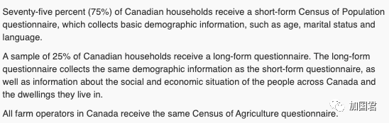 25%加拿大家庭则会收到长问卷调查。长问卷除了收集与短期问卷相同的人口统计信息外,还会调查有关社会、经济状况以及其住所的信息。