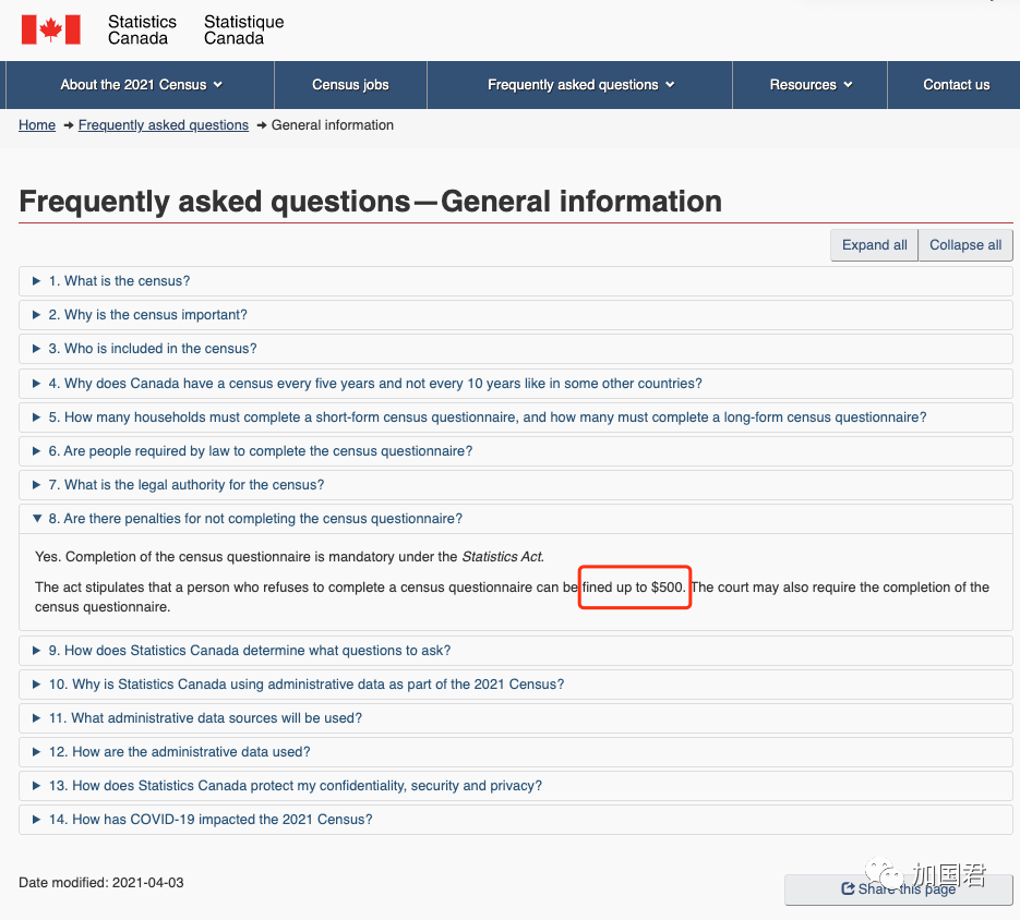 如果拒绝接受人口普查,加拿大统计局4月3日在网上答疑表示,将会罚款高达500加元。