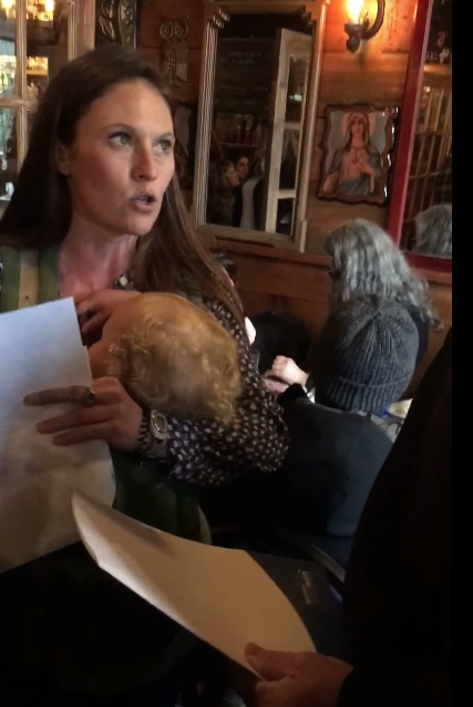 当时餐厅内有顾客在围桌堂食,还有人不戴口罩,违反社交距离,大喊大叫。卫生官员和警察接到举报后来到餐厅,怀抱婴儿的女店主不戴口罩接受调查和询问。