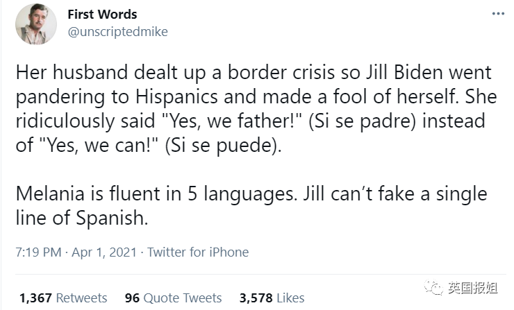 一直以高学历、最有文化的第一夫人著称的Jill,突然“人设”翻车,一口塑料西班牙语引起全网群嘲。