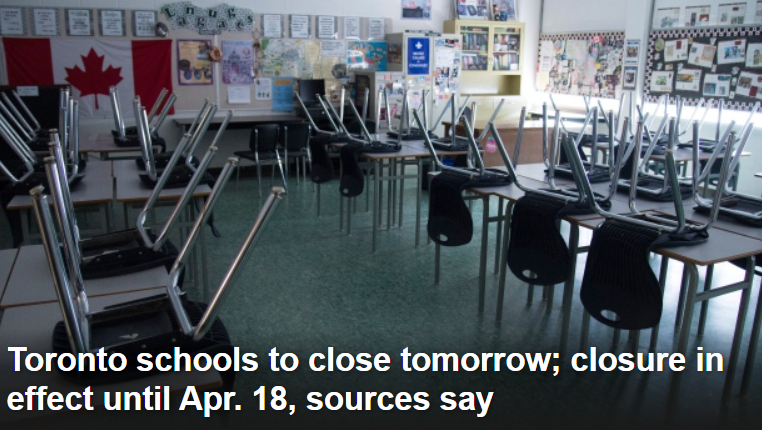 今天下午,多伦多教育局突然宣布,多伦多地区的学校也将关闭学校改为网课,从明天(周三)开始,多伦多的学生将同皮尔区一样开始远程学习,直到4月19日恢复上课。