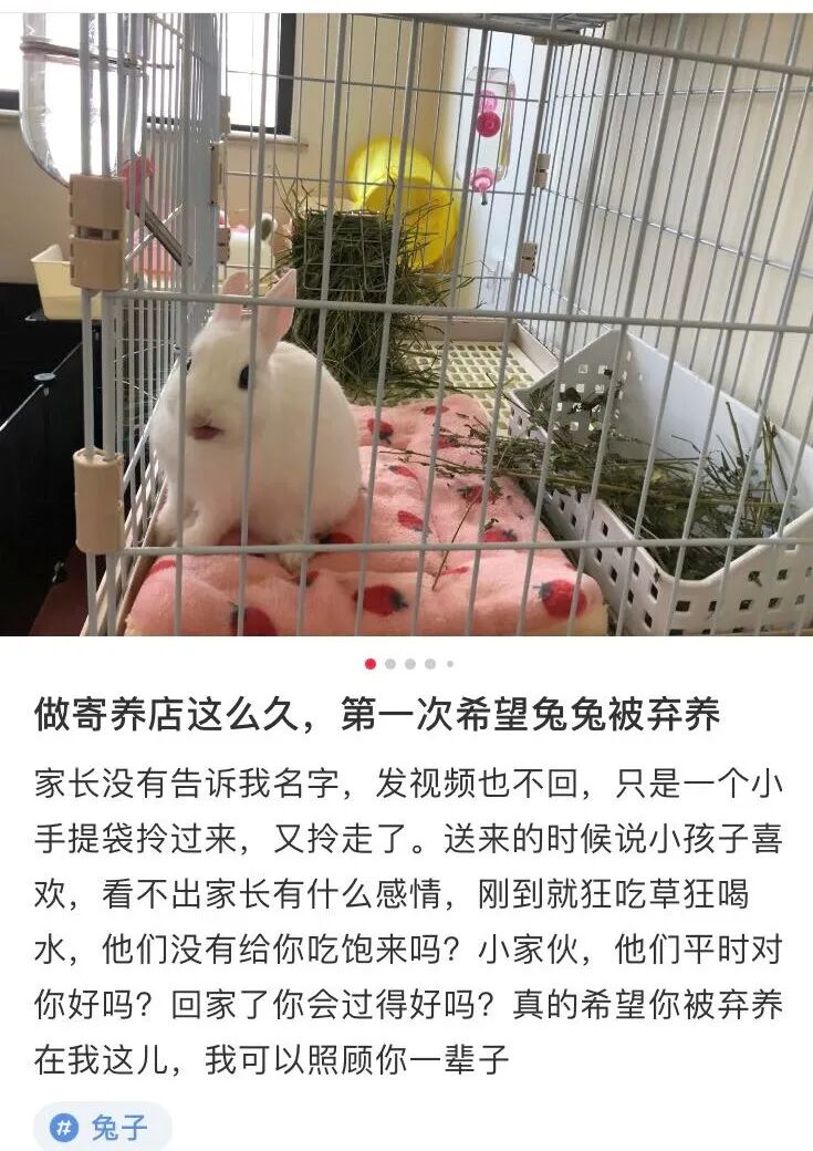 弃养兔子的现象不止发生在国外,就算没有复活节,在国内养兔子的人也常常是随意买来,随意丢弃。小红书上也能看到很多图片被弃养的帖子,还有主人直接把兔子扔在寄养店里。