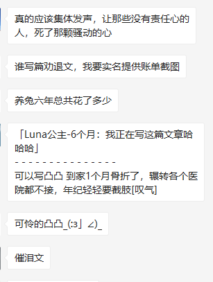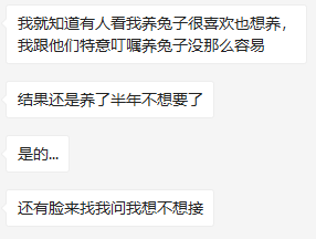 兔子主人们也是很铁不成刚,甚至希望集体呼吁社会,劝退那些心血来潮的养兔人。