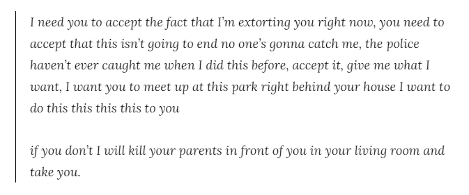 加拿大17岁美女学生当网红,引来杀身之祸!遭疯狂男粉胁迫啪啪啪!2021-04-06 |作者: | 来源:加拿大留学生问吧加拿大Loading...分享:#加拿大#网红 “网红”,“博主”, 近年来已经成为, 年轻一代羡慕的新兴职业, 不仅能收获大量粉丝的喜爱, 同时,收入也十分可观! 然而,就在不久前, 一名拥有200万+Tik Tok粉丝的 17岁多伦多美女网红Ava Rose Beaune, 却突然宣布退出抖音! 背后的原因令人毛骨悚然, 没想到当网红竟给她和她的家人, 招来了杀身之祸! 第一次接触抖音的时候, Ava还是一名15岁的高中生, 在此之前她没怎么用过社交媒体, 由于身边的朋友都在玩儿, 并且不断怂恿她, 2019年她也开了一个帐号。 她发布的内容就是一些简单的 跳舞、化妆和对口型视频。 但却在短短几天内, 吸引了超过15万粉丝关注! 吓得妹子赶紧停用了帐号… 后来, 在调整好心态后, 为了赚钱她决定再次尝试。 在接下来的一年中, Ava签约了一家经纪公司 TalentX Entertainment, 并定期发布视频, 很快粉丝数就涨到了280万。 当时还是高中生的她, 靠着这份兼职赚的比父母还多。 不过, 每当Ava发布新视频时, 总会有一些仇恨评论, 对她进行身体上的羞辱, 甚至还有一些用户创建账户, 来发布关于强奸她的污言秽语… 内心强大的Ava没有理会这些人, 她深知这是成为网红的必修课。 直到一名疯狂的粉丝, 开始跟踪和干扰她的生活… 噩梦开始了! 2020年7月中旬的一个下午, Ava正在朋友家玩, 她试图给爸爸发短信, 却一直发不出去, 她才发现自己的手机没信号了。 当时她觉得很奇怪, 但也没有多想, 直到恢复信号后, 她的手机信息炸了! 她的家人和朋友, 全都以为她要自杀! 原来, 有人黑进她的Facebook帐号, 发布了一段暗示自己要自杀的话。 而且,她的Ins帐号也被黑了, 有人冒充她发布了一条奇怪的动态: “我正式宣布我在和黑客约会, 关注@kittenkiller13,他会回关的!” ↓↓↓ 而且在这个名为@猫咪杀手13的 黑客帐号的图文下, 还有来自Ava账号的评论: “我爱你,你就是一个传奇!” 显然, 这也是黑客使用Ava帐号留的! 这还没完, 猫咪杀手还不断用Ava的帐号, 发布各种恶心下流的动态, 以及辱骂粉丝等。 ↓↓↓ “我可真是个传奇! 你们见过一个男人黑进女孩的帐号, 只为了告诉她,他爱她吗?!” 为他的杀人犯友人喊冤。 无端辱骂粉丝: “快自杀吧,愚蠢的妓女!” “那些让我把Ava裸照放出来的人, 闭嘴吧,我可不会这么做。 她的裸照只能让我享用。” 最令人作呕的是这一条: “Ava, 我等不及要搞大你的肚子, 和你结婚。 你家离我只有5分钟 #马上就来” 更可怕的是, 这个陌生的疯狂粉丝, 不仅黑了Ava的所有社交帐号, 还能控制她的电子邮件、 短信、通讯录等! 甚至给她的父母打电话, 要求和她说话。 Ava在电话中, 恳求他不要再骚扰自己和家人, 至于那些社交媒体帐号, 他想干什么就干什么吧… 结果, 这名男子非常露骨地说: “我只想与你见面, 和你啪啪啪!” 后来,Ava发现该男子, 是使用一种称为SIM swapping的方法, 来破解她的帐户的。 该男子联系了她的电话运营商, 谎称自己拥有该帐户 并要求他们将对SIM卡的访问权限, 转移到他自己的电话上。 Ava得知真相后, 夺回了帐号的掌控权, 但骚扰并没有停止! 在接下来的日子里, 这名男子每天都给Ava发短信, 称要“强奸她,得到她,监视她”… 如果说, 这些都还是停留在言语上的骚扰, 那些接下来发生的事情, 让Ava意识到了真正的危险。 2020年年末的一天, Ava妈妈的车窗被石头砸碎了, 上面还贴着一个威胁性的纸条: “我要带走你,让你怀孕!” Ava报警后, 被要求搬离家里一段时间。 她去了一个朋友家借住, 没想这名男子又追来了, 像恶魔一样阴魂不散! 该男子给她发送了一段, 非常恐怖的阅后即焚信息: “接受我正在强迫你的事实, 你必须接受,这一切不会结束, 因为没有人能抓住我, 我以前也干过这种事, 警察是抓不到我的。 接受吧,给我我想要的, 我要你在这个房子后面的公园和我见面, 让我为所欲为。 如果你不照做, 我会当着你的面, 在你家客厅杀了你的爸妈, 然后把你带走!” Ava用朋友的手机, 录下了这段文字证据, 并交给了警方。 她们全家被带到另一个地方, 住了两个星期。 那段时间, Ava还不断收到男子的信息, 威胁她最好乖乖听话。 几天后, 该男子因离开了他用来 掩盖自己真实位置的VPN半秒钟, 被警方找到并逮捕! 警方在他的家中, 搜出6部手机和一堆SIM卡, 里面全是Ava的照片和视频。 目前,此案还在审判中。 一直生活在恐惧中的Ava, 终于得以喘口气。 这件事给她留下了阴影, 也给她的父母带来巨大的压力, 因此她决定停止在抖音上发布视频, 用更多的时间陪伴自己的家人和朋友。 不过, 她偶尔仍会在Ins上发帖。 Ava称她不会在网上分享这些经历, 因为有些人只会冷嘲热讽, “一个所有人都喜欢的Tik Tok网红, 还有什么可抱怨的, 这些男孩都爱你啊!” Ava回应说, “我希望大家明白一个道理, 你有很多的粉丝, 不意味着你拥有完美的生活, 有很多的男孩爱你, 也不能成就你的生活, 希望所有想要当网红的人, 能保持清醒。” 虽说Ava的遭遇可能比较极端, 但是网络红人遭受骚扰的事, 真的再平常不过了。 大家只看到他们的光鲜亮丽, 却不知道他们承受的 这些不为人知的攻击和伤害。 希望网络上可以多一些善意… 声明:转载此文是出于传递更多信息之目的,并