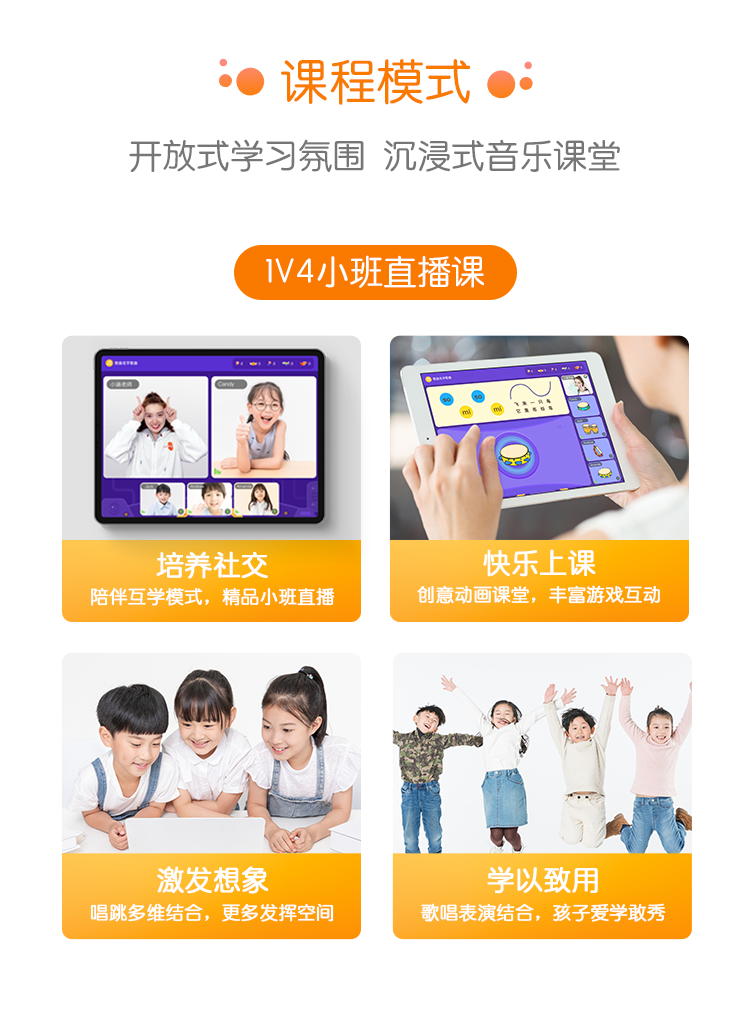 海豚音乐在线音乐课是1v4小班授课模式,真人老师直播互动,每节课40分钟。