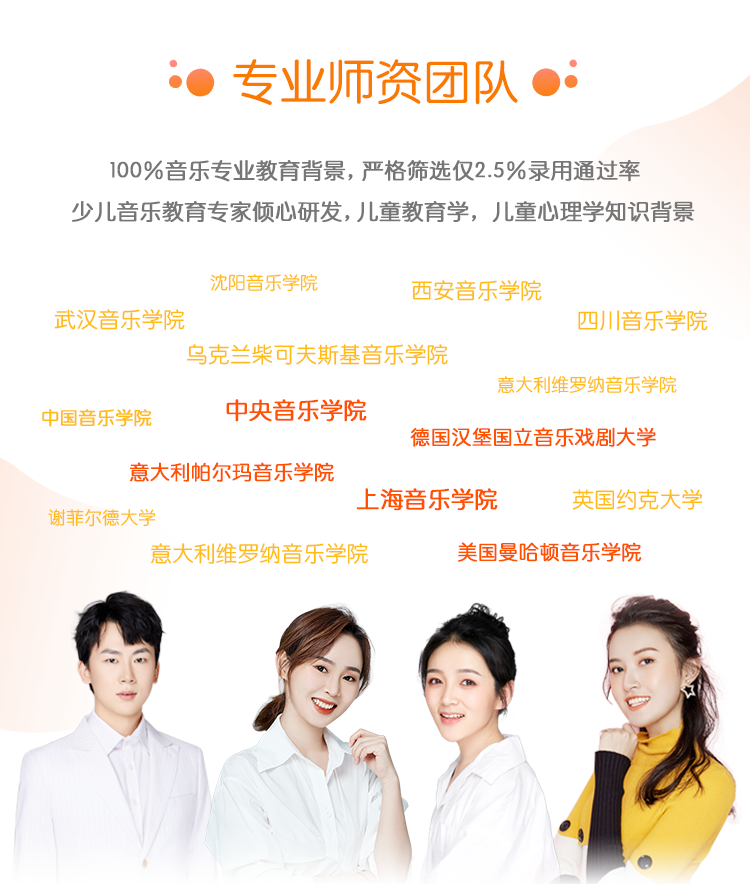 每一节课都由叶婷老师亲自主导课程研发和打磨,并严格考核每一位音乐老师。老师来自于国内外知名音乐院校,比如上海音乐学院、中央音乐学院、美国曼哈顿音乐学院等。