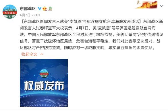 美舰穿航台湾海峡,中国东部战区回应!2021-04-08 |作者: | 来源:人民日报中美军事Loading...分享: 东部战区新闻发言人张春晖空军大校表示,4月7日,美“麦凯恩”号导弹驱逐舰穿航台湾海峡。中国人民解放军东部战区全程对其进行跟踪监视。美舰此举向“台独”传递错误信号,蓄意干扰破坏地区局势,危害台海和平稳定,我们对此表示坚决反对。战区部队将严密防范警戒,随时应对一切威胁挑衅,忠实履行担负的职责使命。 来源:东部战区微博 本期编辑:李娜、赵雅娇 声明:转载此文是出于传递更多信息之目的,并非代表本站支持其观点。若有文字、图片及视频等素材来源标注错误或侵犯了您的合法权益,请作者持权属证明与本网联系,我们将及时更正、删除,谢谢。阅读 未经允许不得转载:加拿大乐活网 »美舰穿航台湾海峡,中国东部战区回应!分享: