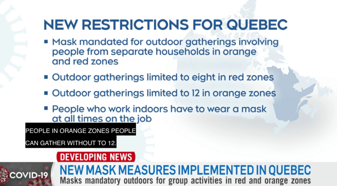 魁北克省今天(4月8日)执行新的限制措施,包括在红色和橘色区域的所有跨家庭户外聚集都必须佩戴口罩;红色区域的户外聚集人数最多8人;橘色区域的户外聚集人数最多12人;在室内的工作人员必须全城佩戴口罩。