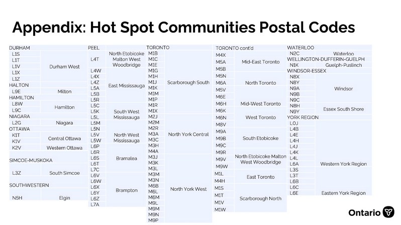 安省确认100个邮政编码(下图)为疫情高发区,将安排“流动诊所”进驻这些社区为18岁以上成人接种疫苗。但省府还没有宣布具体时间表。