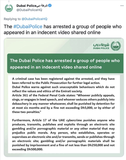 迪拜警方表示,这些因“不雅”录像而被捕的人已被转交给公诉机关。警方的声明中说,这种不可接受的行为违反了阿联酋社会的基本价值观和道德规范。