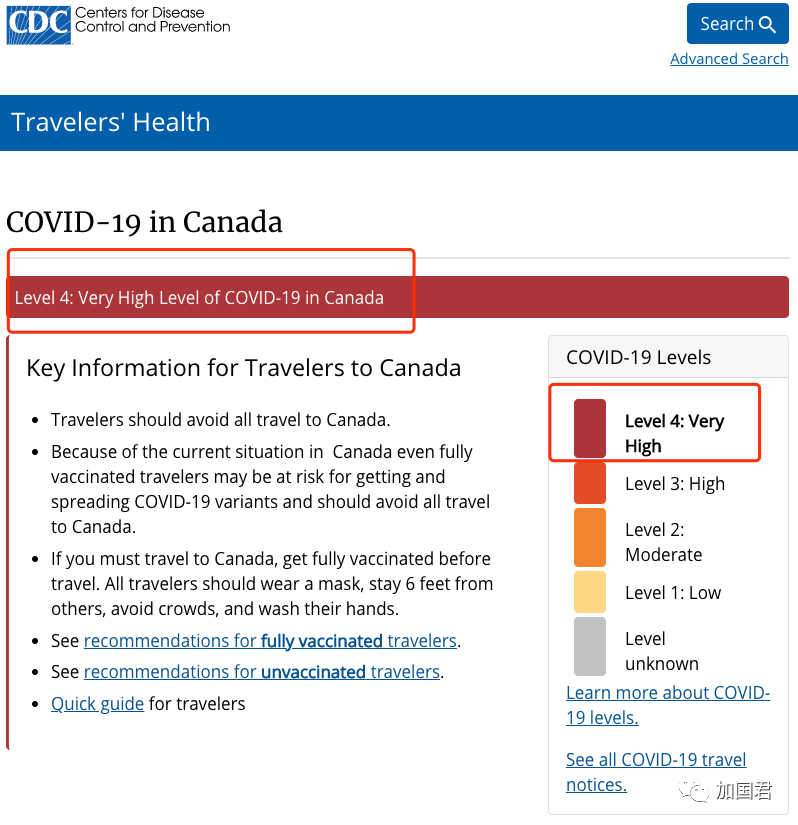 4月2日,CDC疾病防控中心将加拿大的疫情级别调整为最高的level 4,建议国民不要到加拿大旅行。