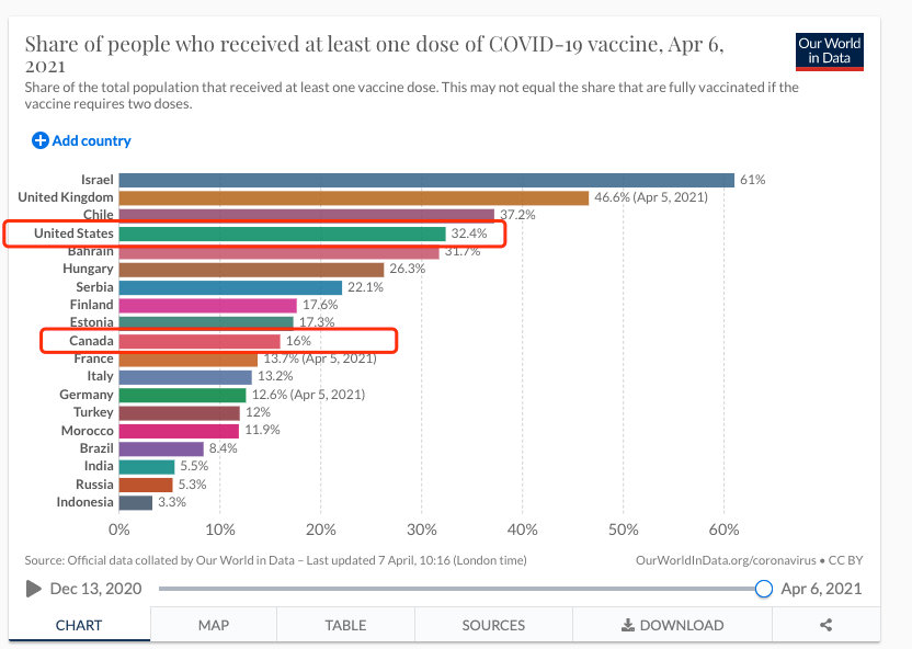加拿大目前疫苗接种600万人,只有16%的国民获得至少一剂疫苗,而相比之下,美国实施保护主义,对在国内生产的疫苗实施限制,美国接种率32.4%。
