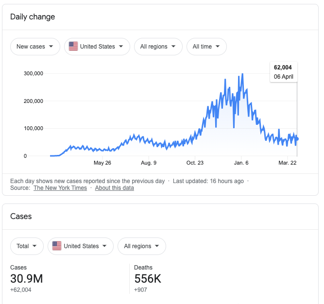 美国确诊总数为3090万人,死亡55.6万,目前日增6万例。