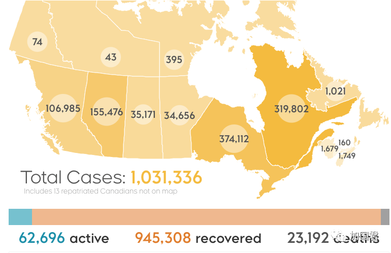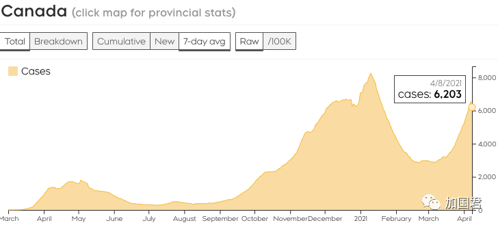 加拿大遭受第三波疫情袭击,总确诊人数超过103万,并且每日以6200多例的速度不断上升。