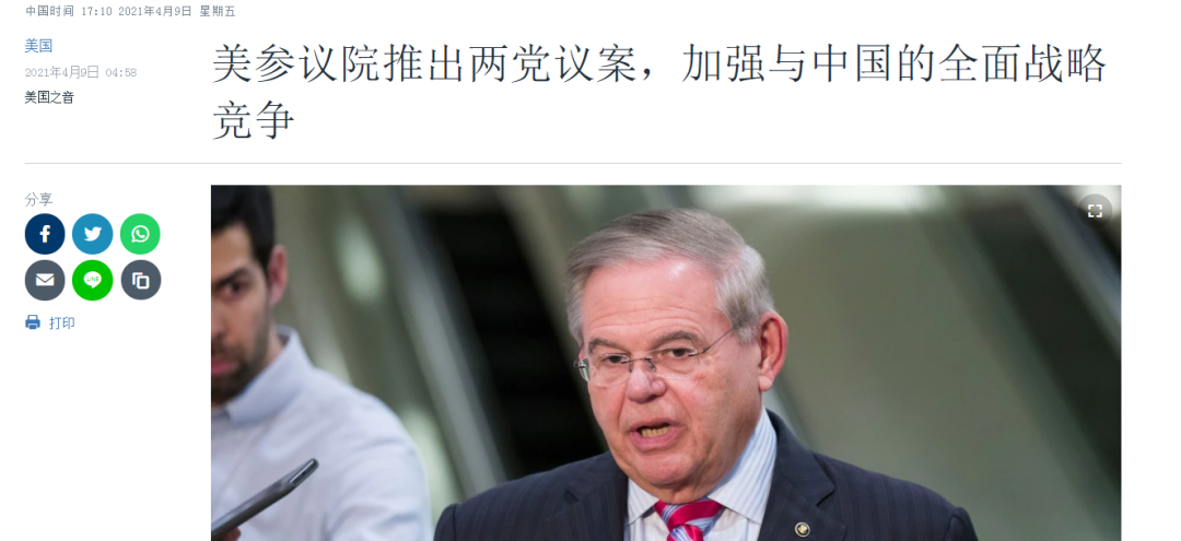 其次,美国国会一些政客在接受媒体采访,谈论这一议案时,都提到将“加强美国与中国开展全面的战略竞争”,认为这是民主共和两党参议员首度共同推出的、与北京开展战略竞争的重要议案。
