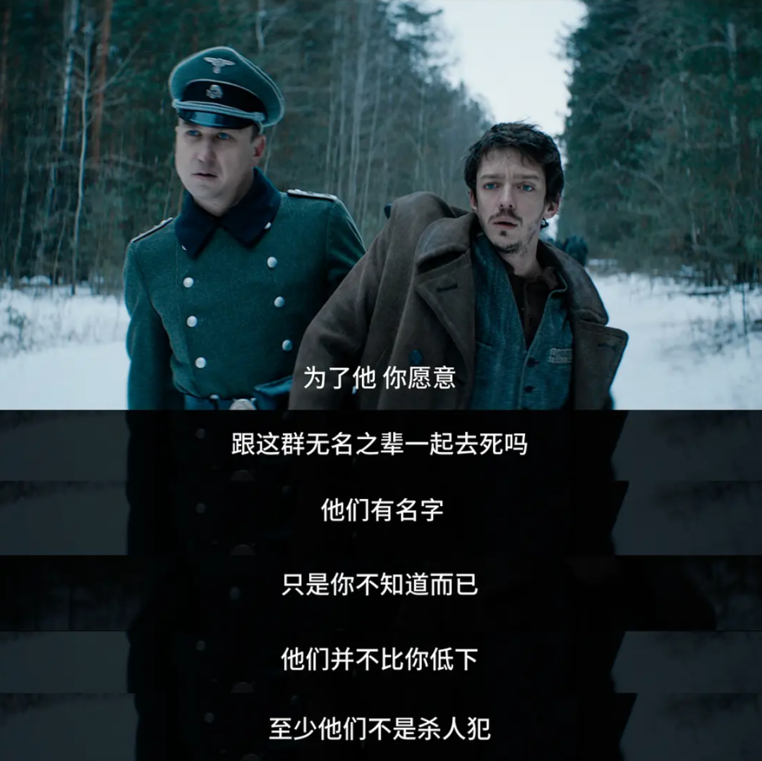 语言成为其中的媒介。当吉尔斯与科赫两人在集中营里开始频繁使用其他人不懂的话语交谈时,对科赫来说,吉尔斯不再是个“无名之辈”。所以当吉尔斯决定为了他人赴死时,科赫愤怒地把他从队伍中抓了出来怒吼道:“为了他,你愿意跟这群无名之辈一起去死吗?!”