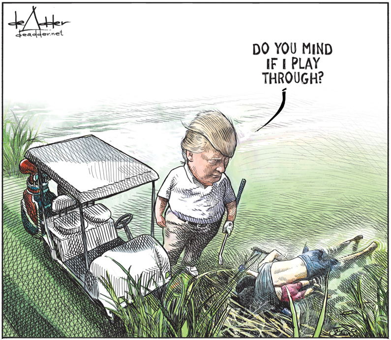 2019年6月26日,De Adder在twitter上发表了一幅以美国前总统特朗普为主角的讽刺漫画。漫画中,特朗普在两名溺水身亡的移民身边打高尔夫球,还问道,“你们介意我继续玩下去吗?”