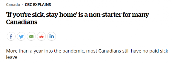 4月9日,CBC刊登了一篇名为《“生病就待在家”对许多加拿大人只是一句空话》的文章,抨击加拿大“带薪病假”名存实亡——大多数加拿大人在工作单位根本没有带薪病假,而联邦政府的这一福利申请门槛又太高,导致很多人在明明知道自己出现新冠症状的情况下依旧带病上班。