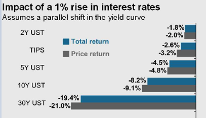 即使利率只上升1%,还远未到达历史平均值,各个期限的债券都可能有相当程度的亏损,越长期的债券,亏损越大: