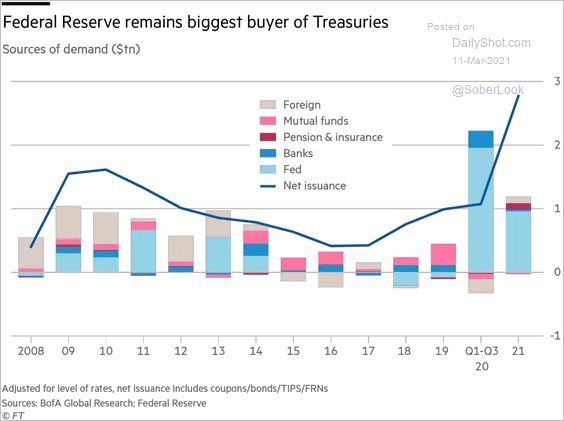 那谁来买这1.9万亿美元的国债? 美国国债的买家可以分为两类:美联储和投资者。投资者包括银行、保险公司、大型养老金、各国政府、海外央行等。