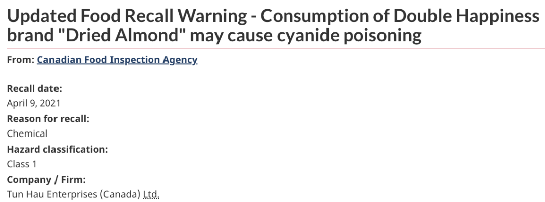 在今年3月,当时就出现大批有机干杏仁和传统南北杏被加拿大食品检验局(The Canadian Food Inspection Agency)召回,原因是它们被认为含有过量的“毒素苦杏仁苷”,会导致人体氰化物中毒。现在,双喜牌南北杏也没有幸免。