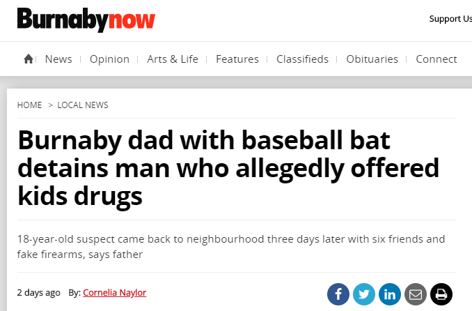 据Burnabynow 的报道,一位不愿透露全名的父亲Mike呼吁家长与孩子们进行一次关于如何面对与陌生人接触的交流,他透露自己10岁的儿子和朋友在Simon Fraser Hills公园操场上被一名年轻男子接近并邀请他们进入车内与另一名男性一起吸食大麻。