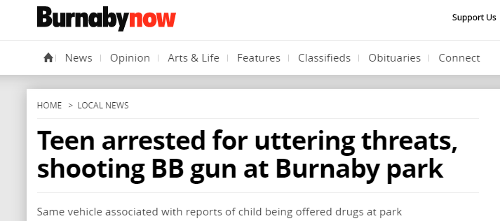 Burnaby皇家骑警证实,警察对公园进行了搜索,并逮捕了一名18岁的男性,他现在有可能面临口头威胁和非法持有枪支等指控,他与之前的两件事件都有关。警方也表示,邻居举报的手枪和步枪最终证实是气枪。