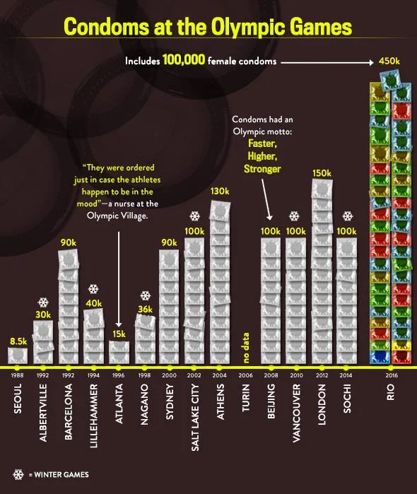 2016年里约热内卢奥运会则创造了避孕套发放的历史。主办方一共发放了45万个避孕套,是前一届奥运会的三倍,其中还包括10万个女性用避孕套。