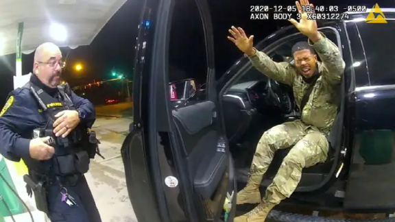 当地时间4月11日,美国明尼苏达州明尼阿波利斯市布鲁克林中心,一名黑人男子在驾车行驶过程中被警察逼停。