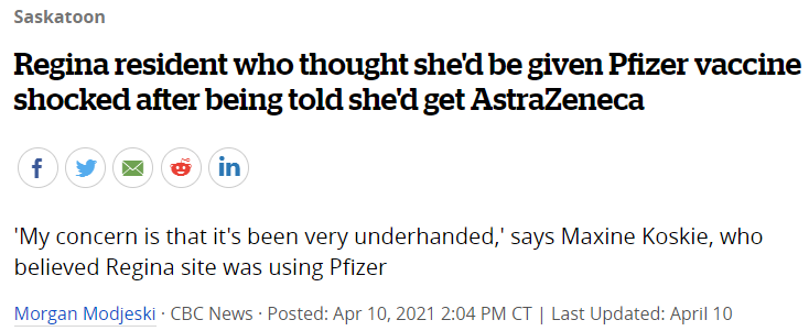 因此,里贾纳市有一些免疫站点,出现了Koskie所遭遇的情况,55岁以上人群优先打阿斯利康疫苗,辉瑞疫苗被优先安排给55岁以下人群。