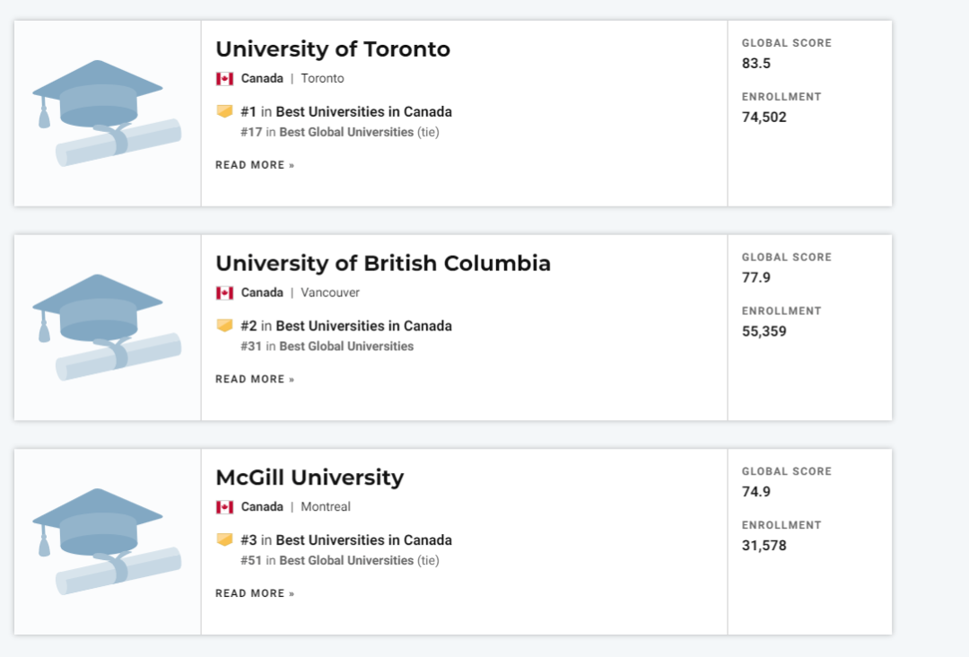 根据U.S.News发布的2021年全球最佳大学排名,加拿大有三所大学入围排名前百。