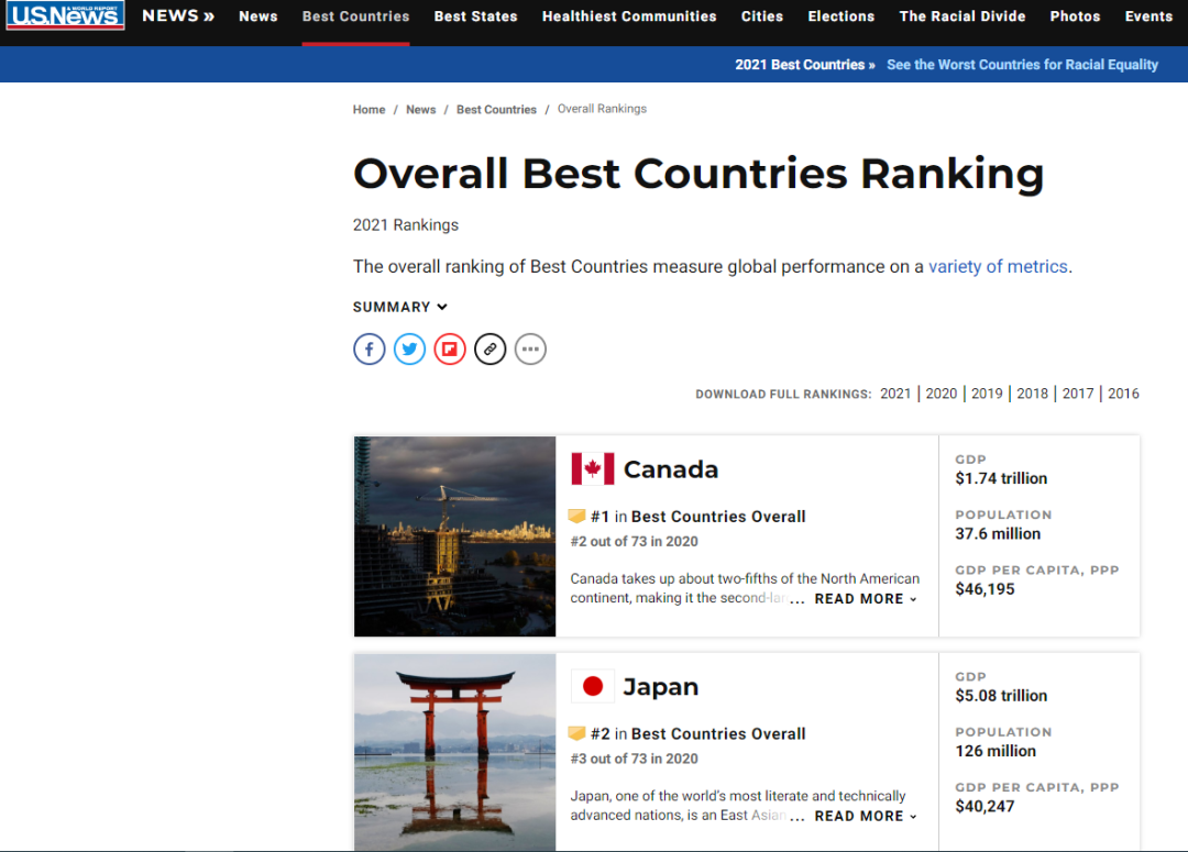 2021年全球最佳国家前十名如下: