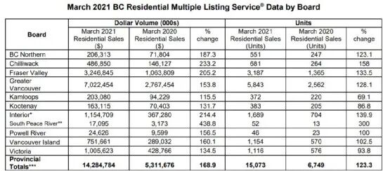 (BC省2021年3月销量与去年同期对比 图自BCREA)