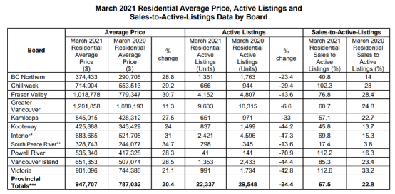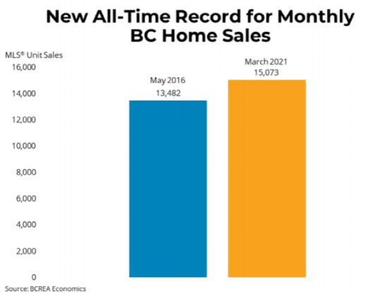 2021年3月BC省共达成15,073笔住房买卖交易。公寓、城市屋、独立屋等所有住房的平均价格为947,707加元,比去年3月足足高了近16万加元,涨幅达20.4%。