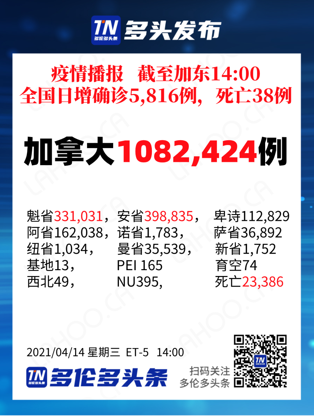 截至今早(4月14日)12点,安省注射了超过342万剂疫苗,占运抵安省疫苗数的76%,337,206名安省居民完成了两剂疫苗的注射。